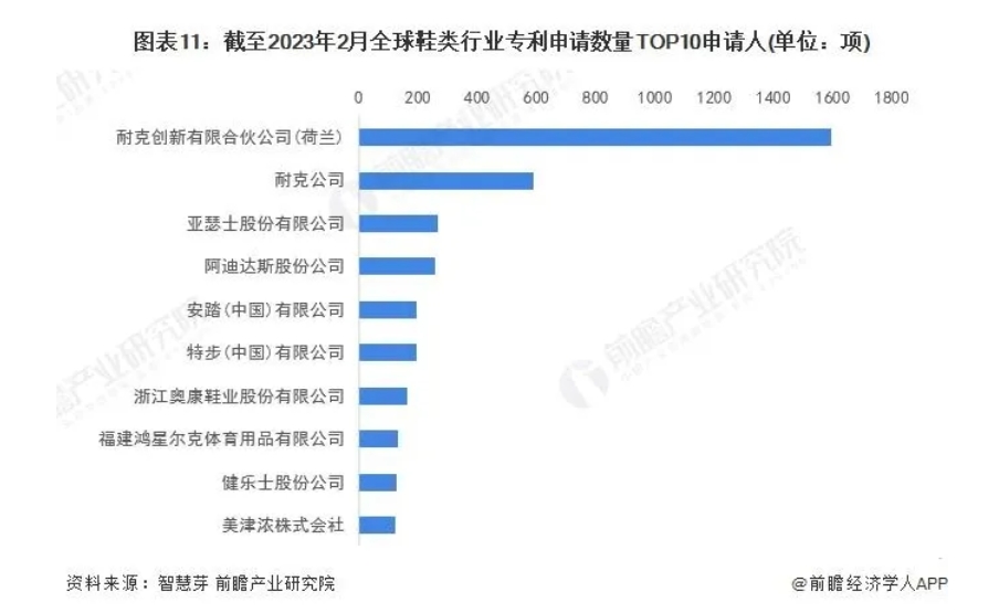 前瞻产业研究院披露的研报显示,2023年2月,全球鞋类行业专利申请数量TOP10申请人榜单中,耐克创新有限合伙公司(荷兰)专利申请数量最多,达1595项;耐克公司排名第二,申请数量为592项,反观安踏的申请数量仅200个左右,排名第五,与特步处于同一水平。